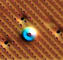 Das große, bläuliche Xenonatom hat sogar ein Loch in der Mitte, durch welches ein Nickelatom sichtbar wird.[Image originally created by IBM Corporation]