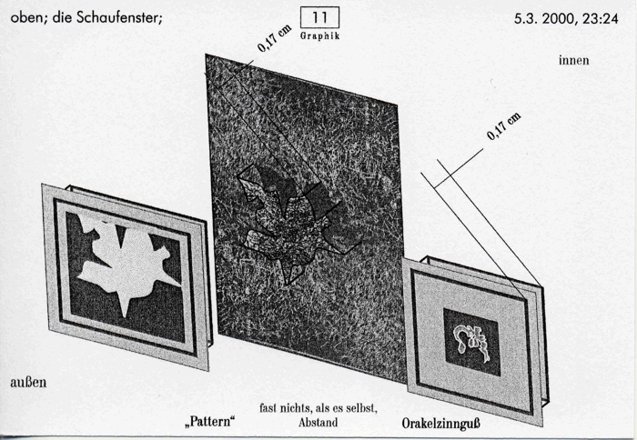 „a) das chinesische Fadenziehen, b) die Gesundheitsbriefchen, c) der Beipackzettel“; Veröffentlichung eines Beiheftes im Katalog. „Placebo heißt, ich werde gefallen“, Projekt in den Räumen der Engelapotheke in Kassel zur Dokumenta 9. [Gemeinsame Ausstellung zusammen mit Thomas Stordel, Tonia Kudrass, Sabine Mohr.]